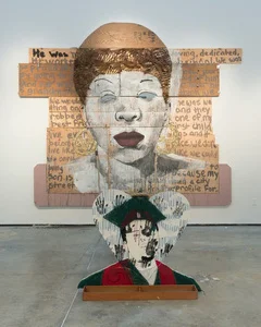 In one of the most impactful moments in the exhibition, the young painter and assemblage artist - a St. Louis native - has composed a striking dual portrait of Ferguson shooting victim Michael Brown and his mother. The work is an altar-like, room-sized installation that uses paint, hair extensions, rope, found plywood and the eulogy that Lesley McSpadden, Michael Brown's mother, wrote for her son.